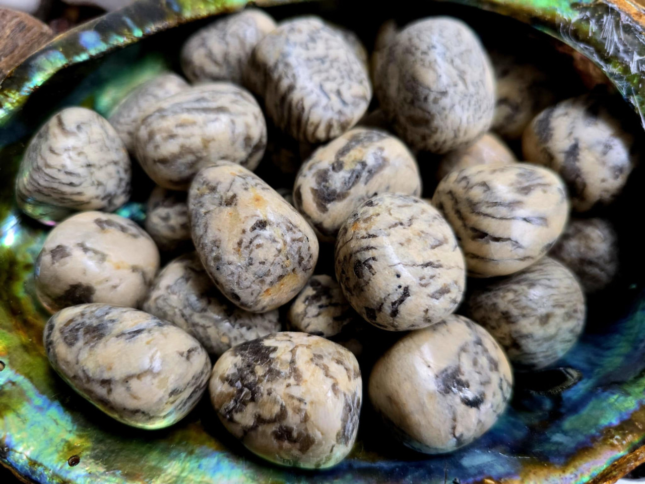 Zebra Moonstone is a striking fusion of Smoky Quartz and Feldspar, known for its earthy grounding energy and intuitive clarity. Its patterned surface resembles ancient script, symbolizing the unfolding of inner wisdom and spiritual insight.